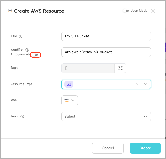 In the AWS Resources catalog page, click Manually add AWS Resource or click the + AWS Resource button to create an entity. The entity's identifier is the AWS ARN of the AWS resource. Ensure sure you toggle off the Autogenerate for the identifier.