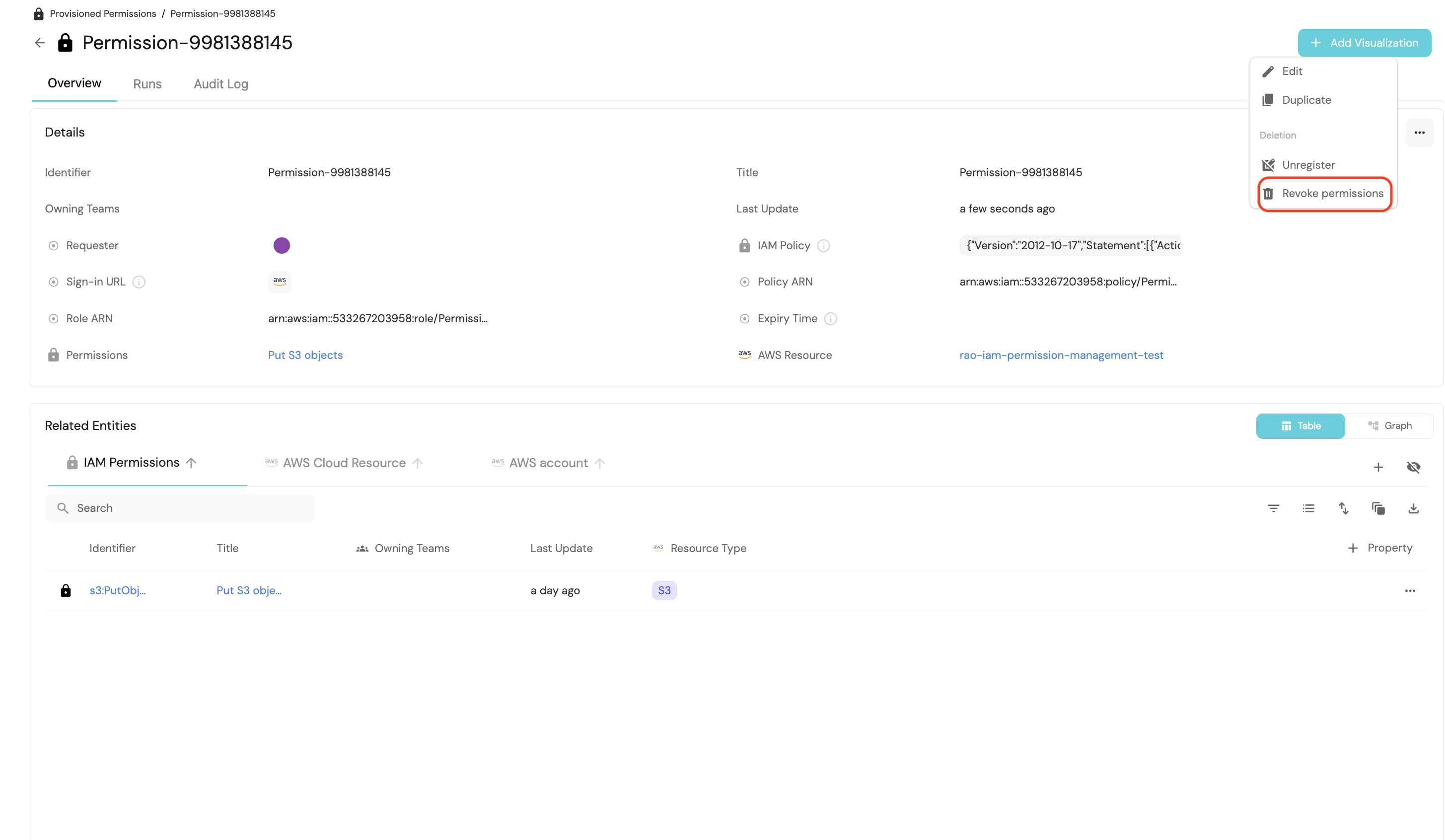Now, we want to revoke the permissions provisioned for our S3 bucket my-s3-bucket. Start by navigating to the new Provisioned Permission entity.